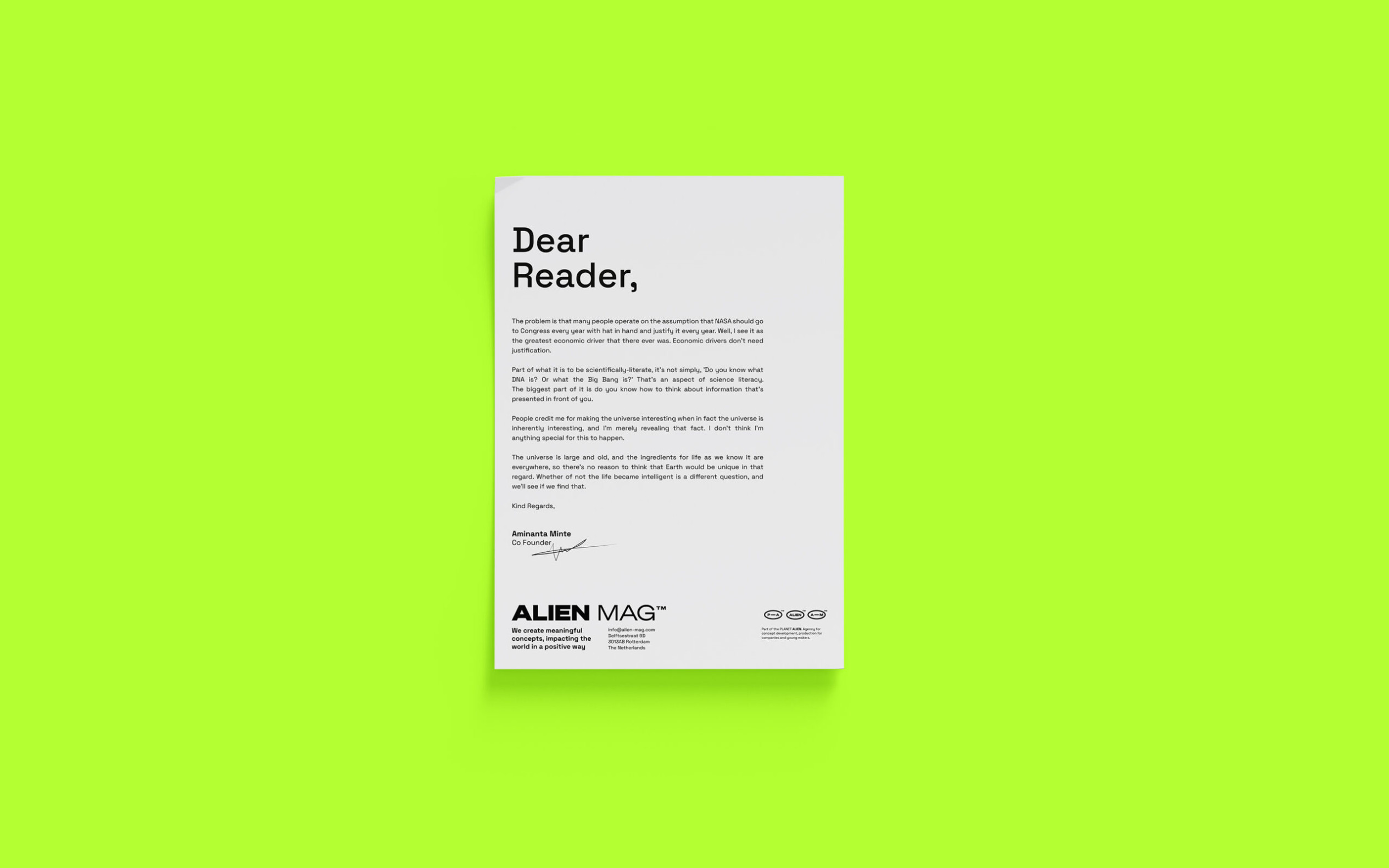 Now, they bring all aspects of their work under one roof, offering a full suite of creative services through their new, bright and shiny creative agency Planet Alien. We love a rebrand as it is always a period of reflection and focus on the future. Making sure new values shine bright and new aesthetics reflect the ideas that shape their progress. With the success of their online magazine, Alien Mag, grew a new need and desire to expand their business and offer the services as a creative agency Planet Alien.